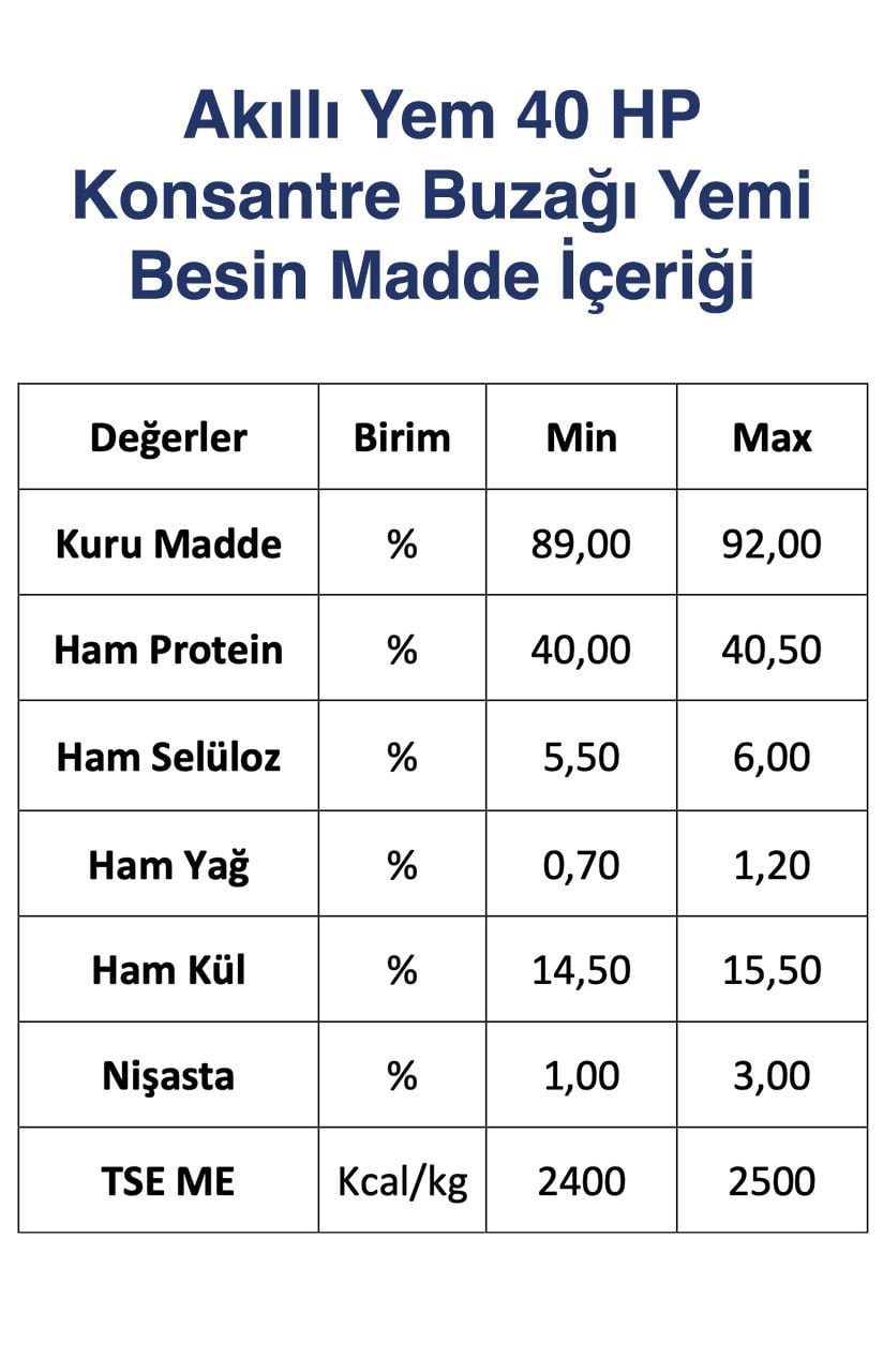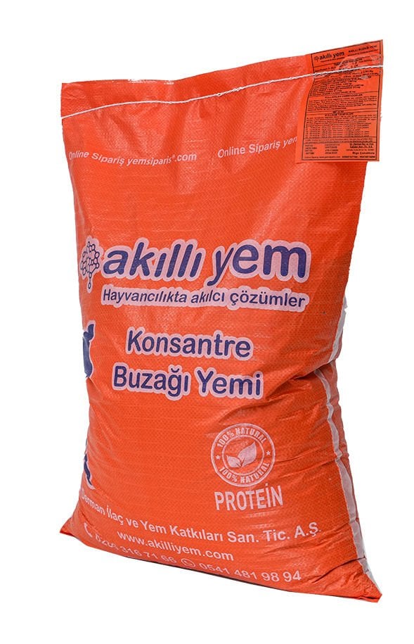 Buzağıların doğumunu takiben 20. günden 180. güne kadar mısır ve arpa kırma / ezme ile birlikte karıştırılarak kullanılması tavsiye edilen, ihtiyaç duyduğu zengin protein ve premiksleri işletme koşullarında eksiksiz bir şekilde karşılamak amacıyla Akıllı Yem 40 HP Konsantre Buzağı Yemi geliştirilmiştir.