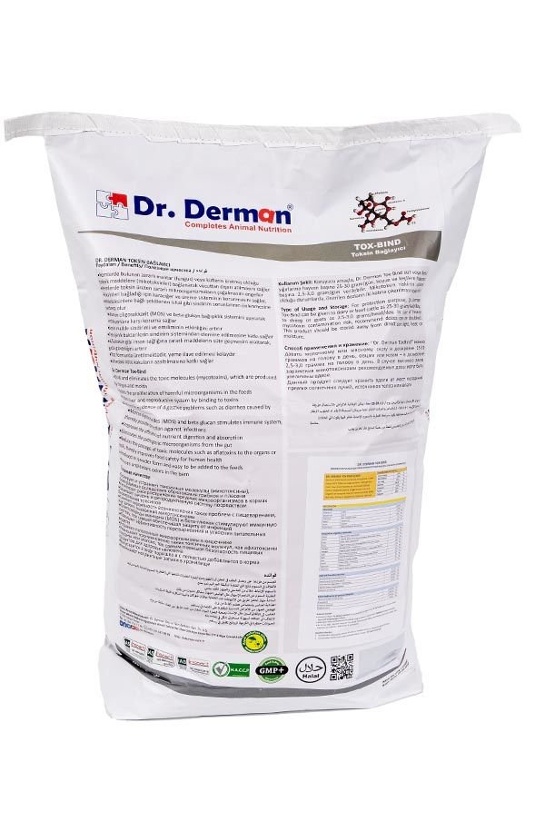 Dr. Derman Tok-Bind çiftlik hayvanlarının sağlığını üretkenliğini ve verimliliğini olumsuz etkileyen mikotoksinleri bağlamak amacıyla formüle edilmiş bir yem katkı ürünüdür.